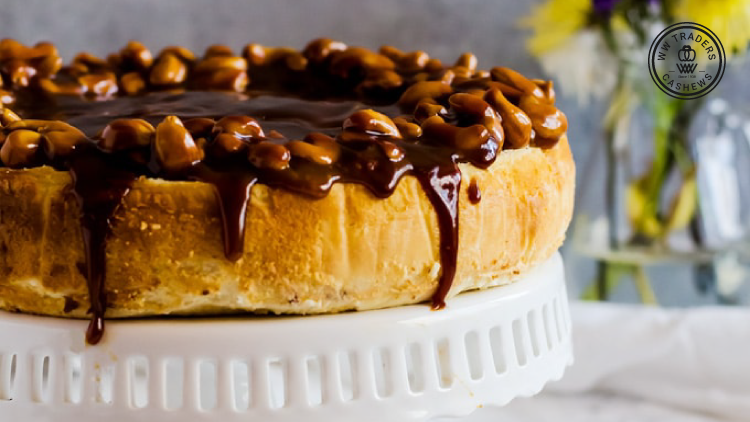 Allow the mixture to cool until it is almost room temperature, but still a little warm to the touch. Toss in the cashews and stir to combine. Spoon out the cashews and place them around the cheesecake. Pour the remaining caramel in the middle of the cheesecake. Top with Fleur de sel.