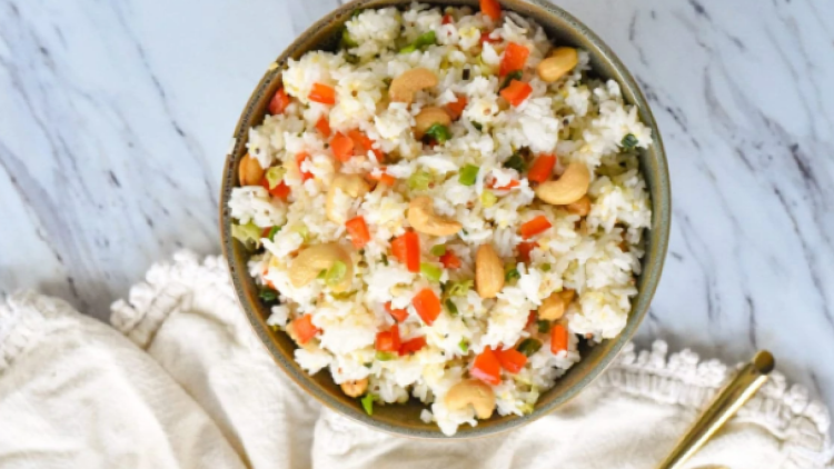 Ingredients: 2 cups Jasmine Rice 3 1/2 cups water 1 tsp salt 1/4 cup vegetable oil 1 tsp yellow mustard seeds 1/2 cup cashews 6 green onions chopped 1/2 red...